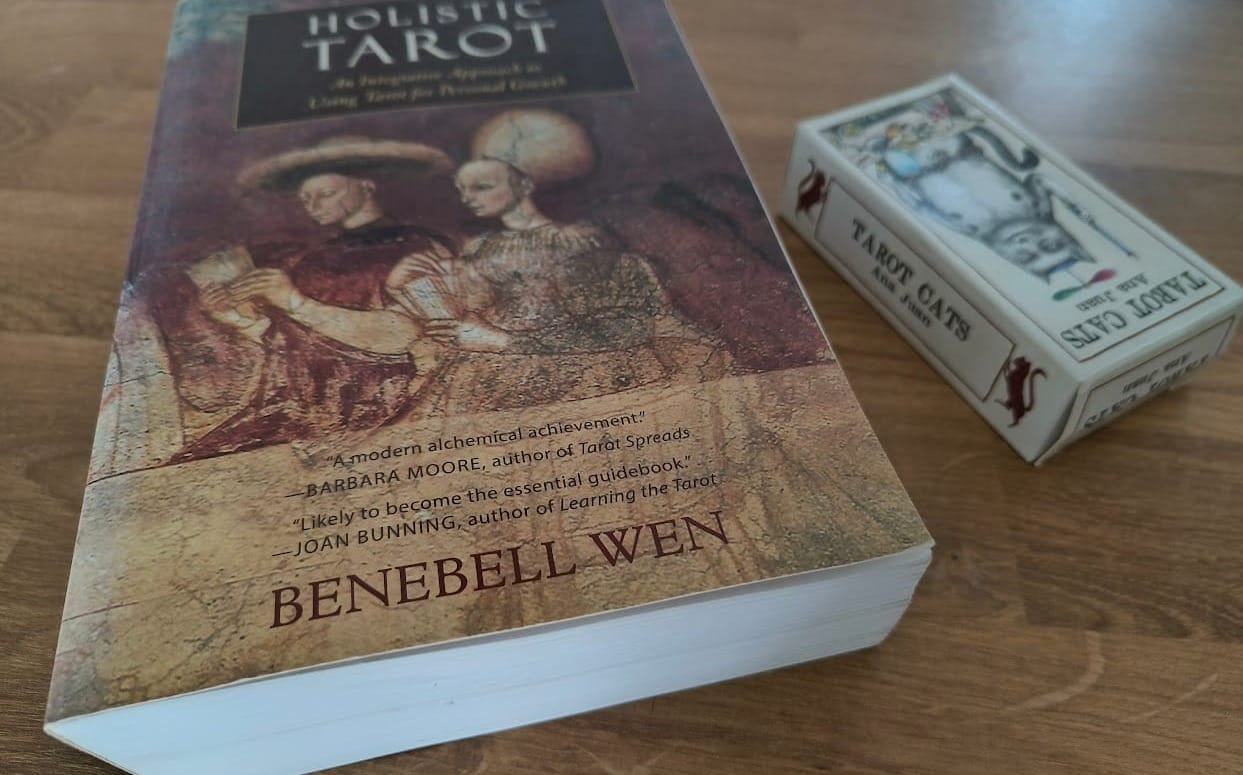 Otro obstáculo importante que se le presenta rápidamente a cualquier aficionado al tarot es el tipo de tirada. Hay docenas de maneras de tirar las cartas distintas, todas ellas válidas, todas ellas buenas. Holistic Tarot de Benebell Wen, que en la actualidad es poco menos que la biblia del tarot, lista la friolera de 35 formas diferentes de tirar las cartas: algunas que emplean una sola y otras usan hasta 36 cartas. Ninguna de ellas es la que hizo mi amigo y me animó a investigar más. Para mí, aquí la clave fue encontrar un tipo de tirada que me hiciese sentir cómodo, que no durase mucho tiempo, pero que me permitiese leer un puñado de cartas. Por eso me terminé quedando con la Cruz Diádica (muy similar a la Cruz Celta, pero con menos cartas).